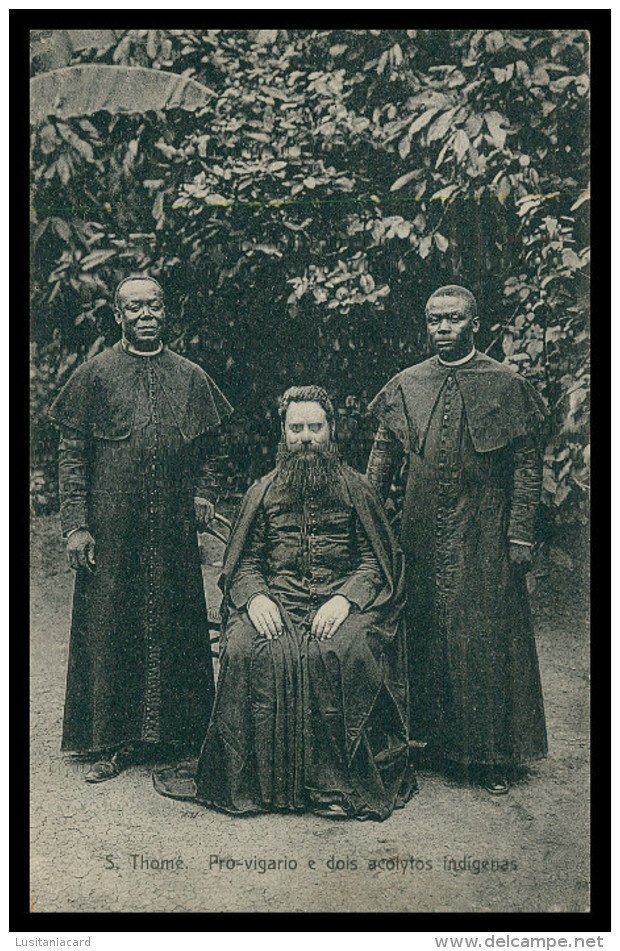 Glass no. 4501 [left] is labeled S. Thomé / Pro-vigario e dois acolytos indigenas ('São Tomé / Pro-vicar and two indigenous acolytes'). A pro-vicar administered a diocese in the absence of a bishop. The diocese of São Tomé was established in 1534 as a suffragan to the archbishopric of Funchal. In 1551 it became suffragan to the archbishopric of Lisbon. It lost territories in 1596 to the newly established diocese of São Salvador do Congo (today diocese of Mbanza Congo, Angola), to which it became suffragan in 1676. It lost further territories in 1741 to establish the vicariate apostolic of Ava and Pegu (today metropolitan archdiocese of Yangon, Myanmar), in 1818 to establish the apostolic vicariate of Good Hope and adjacent territories (today diocese of Port-Louis, Mauritius), and in 1842 to establish the apostolic prefecture of The Two Guineas and Senegambia (today metropolitan archdiocese of Libreville, Gabon). In 1844 it became again suffragan to the archdiocese of Lisbon, and in 1940 was made suffragan to the archdiocese of Luanda (Angola). In 1957 it was renamed diocese of São Tomé and Príncipe. As of 1984 it is not suffragan to another archdiocese but is immediate to the Holy See. In its history, the diocese quite often remained without an ordained bishop and therefore was overseen by appointed administrators. Glass no. 4501 likely dates from some time between 1900 and, say, 1910. According to sources listed below, there indeed was no ordained bishop between 1819 and 1984.